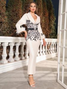 Fashion printed sexy long sleeve feather belt bandage dress long skirt